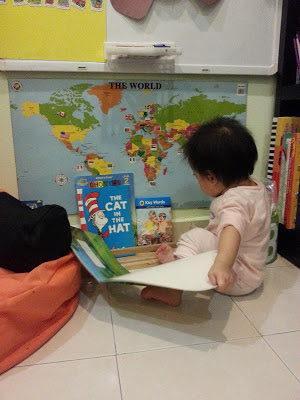We display his books, Dolch words, alphabet stamps, magnetic letters, etc here